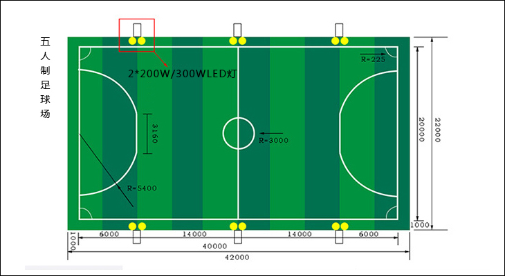 5人制足球場地布燈參考圖: