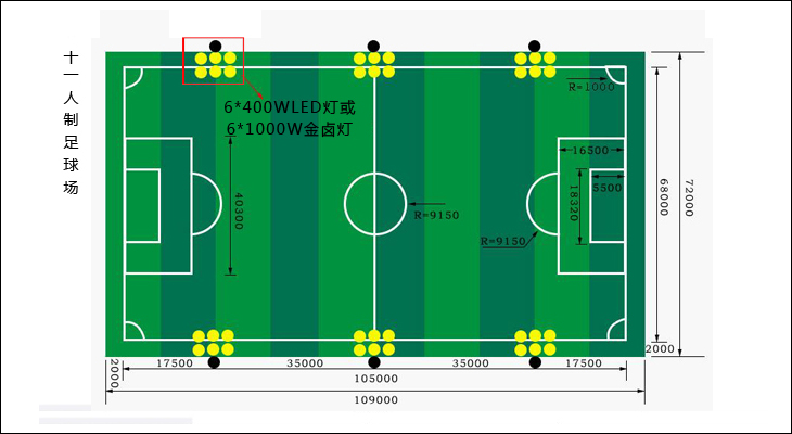 11人制足球場地布燈參考圖: